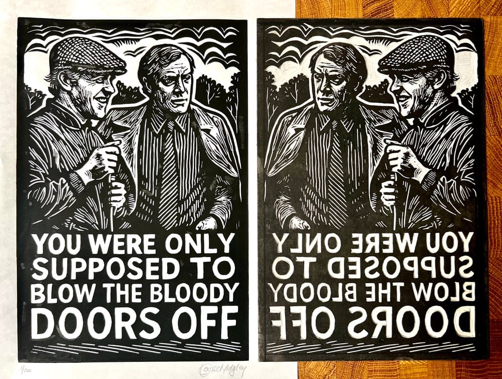 A signed, hand carved, hand pressed, Linocut print of national treasure, English actor Sir Michael Caine, limited to 100 editions.